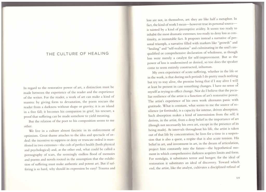 We leven in een cultuur die bijna fascistisch is in zijn dwangmatige optimisme. Grote schaamte is verbonden met het idee en het schouwspel van een pijnlijke beproeving: de impuls om zo’n beproeving weg te drukken, te ontkennen of in te dammen kent twee uitersten – aan de ene kant de verering van een volmaakte gezondheid (lichamelijk en psychologisch), en aan de andere kant wat je een pornografie van het litteken kunt noemen, de schier eindeloze vloed van gedenkschriften en gedichten en romans die zijn gebaseerd op de aanname dat het tentoonstellen van leed wel moet leiden tot authentieke en machtige kunst. Maar als lijden zo zwaar is, waarom zou de uitdrukking ervan dan gemakkelijk zijn? Trauma en verlies zijn op zichzelf nog geen kunst: ze hebben iets weg van een onaffe metafoor. Zo’n werk is in feite aangestoken door een soort ingehouden gulzigheid. Het wil wat al te graag de meest dramatische uitersten belichamen; het ontkent al te gemakkelijk verlies als blijvend, als onherroepelijk. In plaats daarvan vertelt het een verhaal van persoonlijke overwinning, een verhaal dat bol staat met signaalwoorden als ‘groei’ en ‘heling’ en ‘zelfverwerkelijking’, wat uiteindelijk culmineert in het onvoorwaardelijke en alomvattende getuigenis dat de ziel geeft van zijn eigen heelheid, alsof verlies slechts een katalysator voor zelfverbetering zou zijn. Maar als de overweldigende kracht van het verlies wordt ondermijnd of ontkend, dan is het onvermijdelijke gevolg dat we gaan denken dat de spreker een kunstmatige constructie is, geen werkelijk mens.