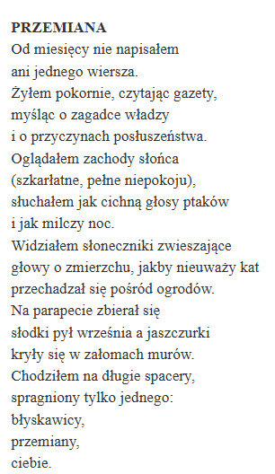 In hetzelfde gedicht zegt Miłosz ook: “Dat de juiste houding ten opzichte van het Zijn respect is en dat we daarom het gezelschap moeten vermijden van mensen die het Zijn verlagen met hun sarcasme, en die het Niets prijzen.”