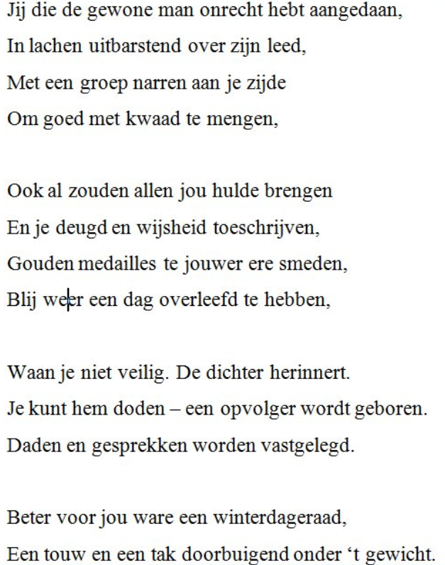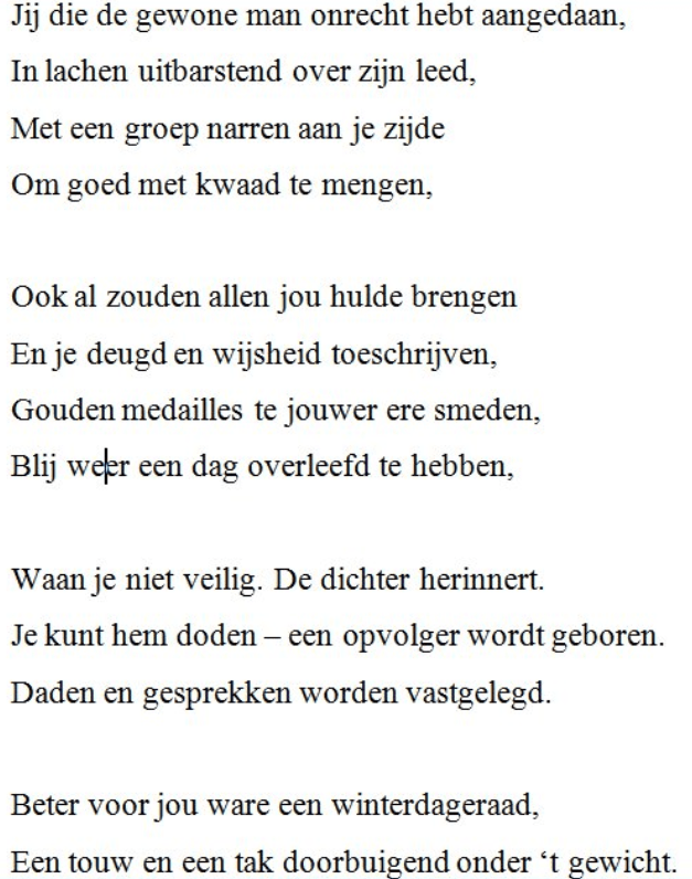 U merkt dat ik wanneer ik naar ‘poëzie’ verwijs dit woord in zijn meest fundamentele betekenis opvat. Samuel Johnson geeft in zijn monumentale woordenboek van de Engelse taal drie definities aan het woord ‘dichter’, in afnemende volgorde van belangrijkheid: allereerst “iemand die verzint”; vervolgens “een auteur van fictie”; en ten slotte “een schrijver van gedichten”.