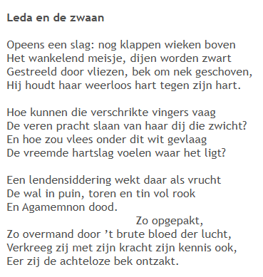 Het vertaalde gedicht – Leda and the Swan – van William Butler Yeats is gebaseerd op een bekende Griekse mythe. Zeus begeerde Leda, vermomde zich als een zwaan en overweldigde haar. Als gevolg daarvan kreeg ze een aantal kinderen, twee van Zeus en twee van haar eigen echtgenoot, onder wie Helena die de aanstichtster werd van de Trojaanse Oorlog, waar uiteindelijk ook de dood van Agamemnon uit voortkwam. In de derde strofe worden de gevolgen van de overweldiging beschreven: de ineengestorte muur, de branden, de dood van Agamemnon.